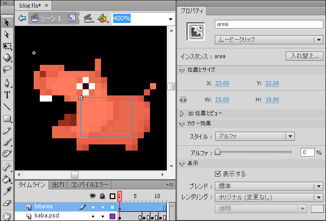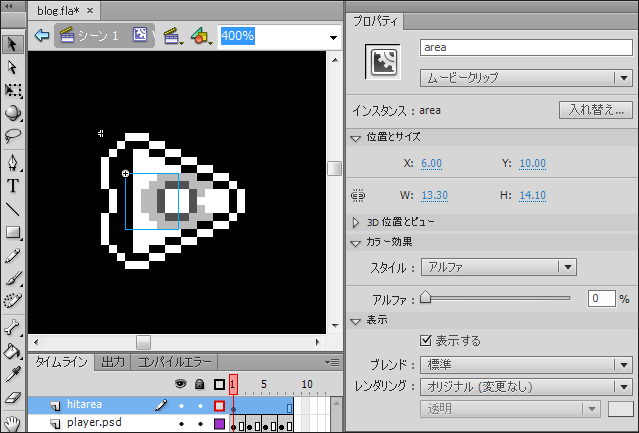 shooting.player.View ムービークリップ上には、機体の当たり判定用として area という透明の矩形ムービークリップをステージ上に配置します。(hitarea という名前にしたい所ですが EaselJS の MovieClip には hitArea というデフォルトプロパティが存在し、混乱を避けるため area という名前にしています。)