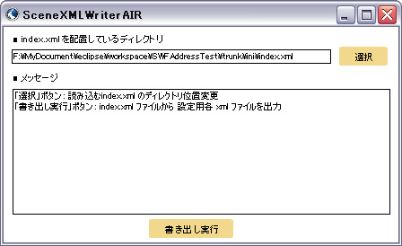 ファイル分割を行なうには AIR を用います。index.xml を AIR で作成したアプリケーションで読み込み、index.xml の内容を解析し、定めたフォーマットに整形した後、コンテンツごとの xml ファイルを出力させます。